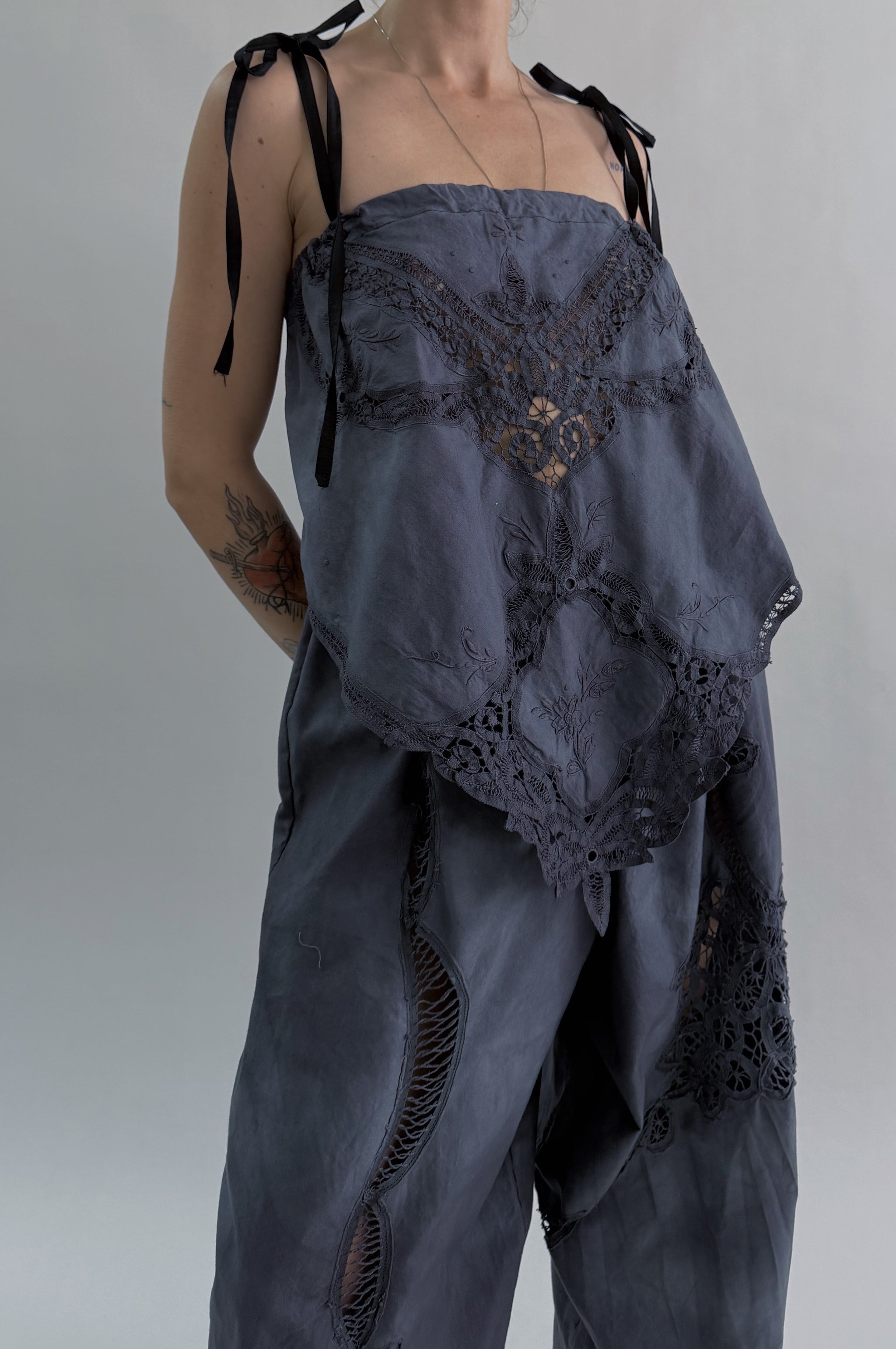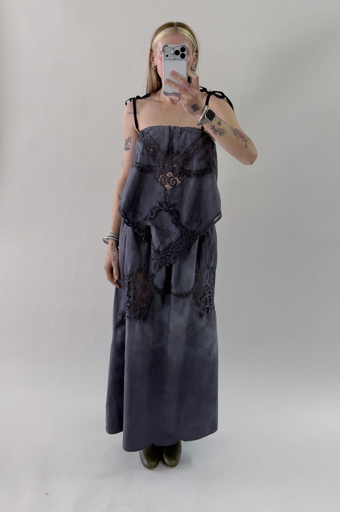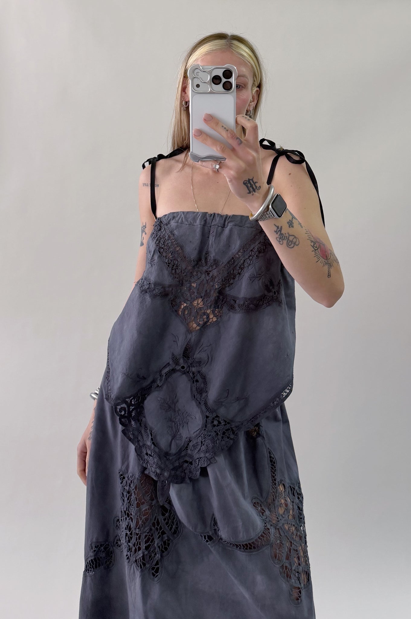 Styles are not pinned, pulled or tucked, they are worn and photographed as-is so that fit is accurately portrayed. Everything is made from vintage, deadstock, or antique materials. Your item may vary slightly from the fabric pictured here or have small flaws. Reducing waste is a top priority, so your item may be patched together slightly, in a non-noticeable way. In another effort to reduce waste, if edges are self finished or will not fray and show, they will be left as-is. The fabric is very delicate, please wear carefully.