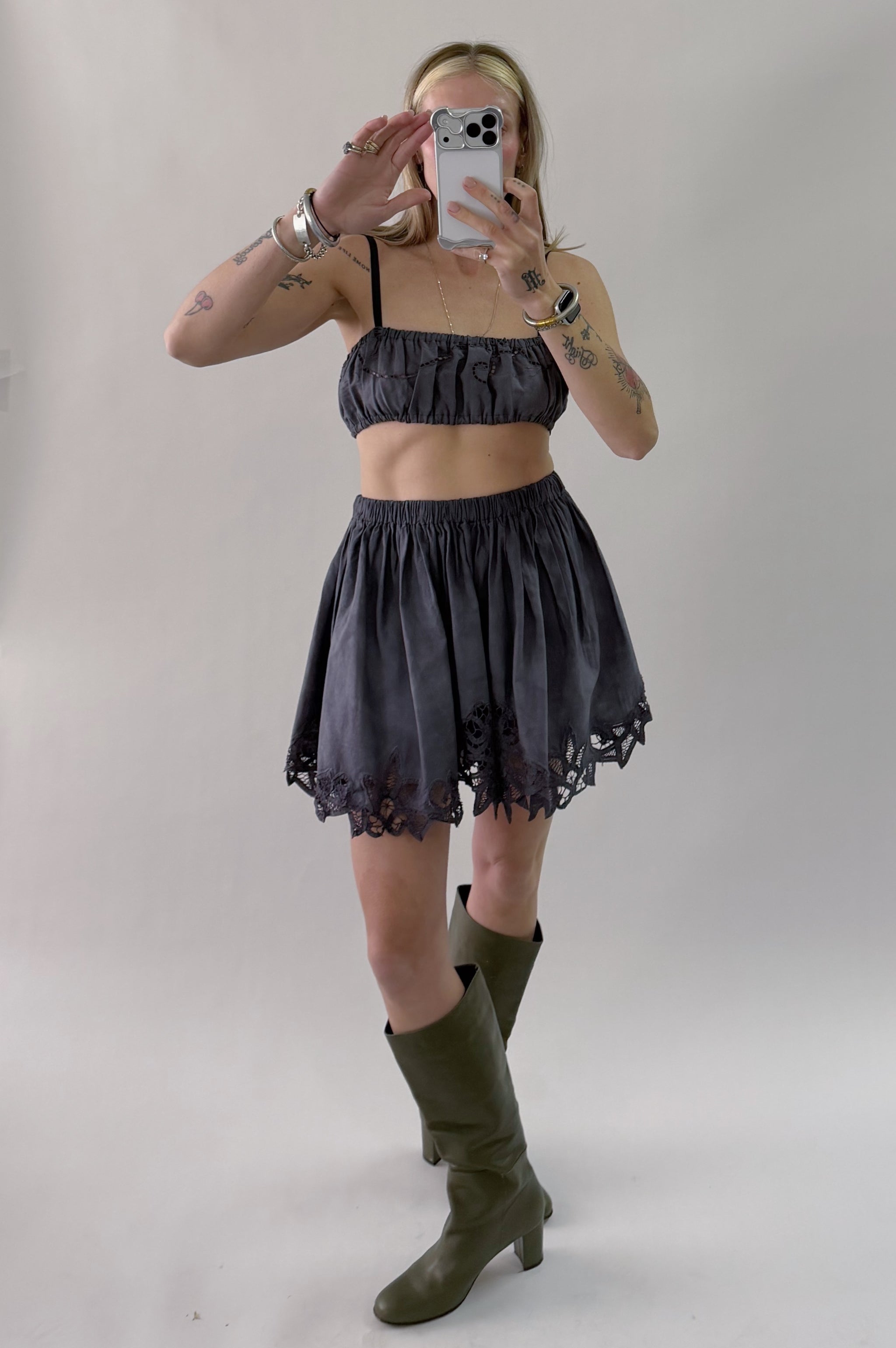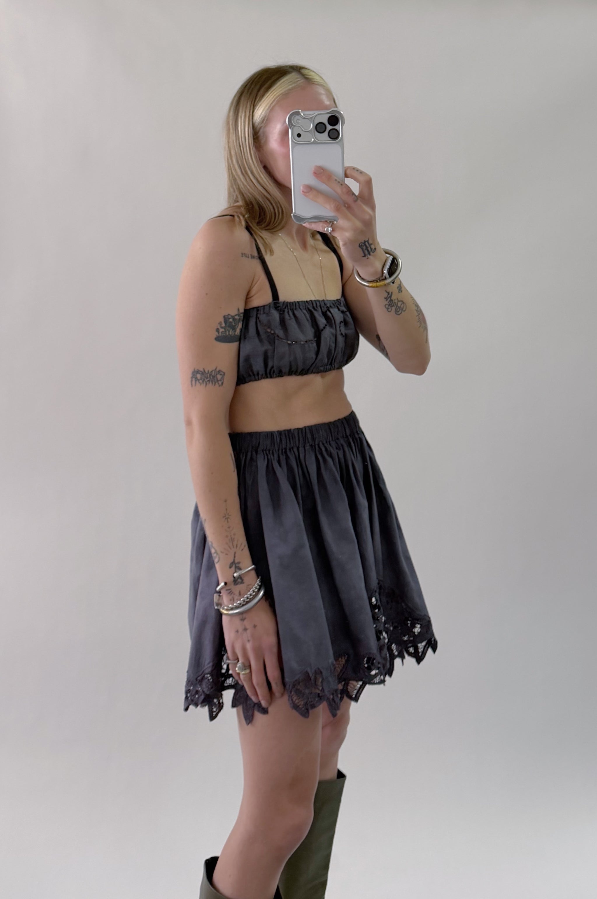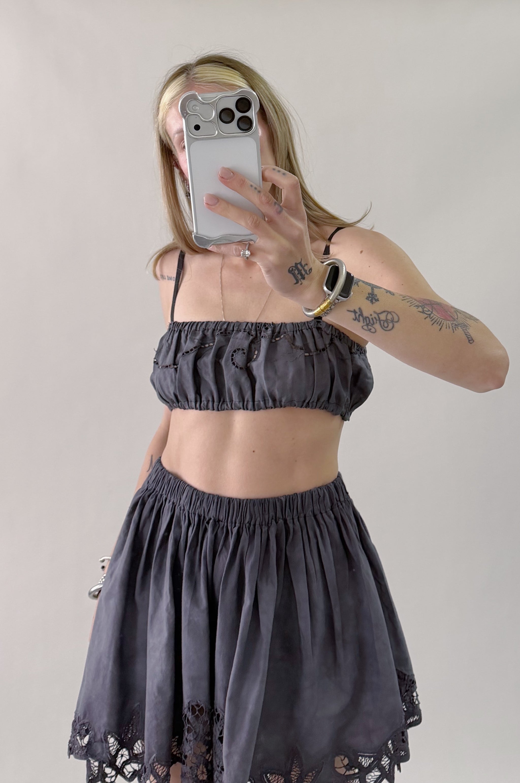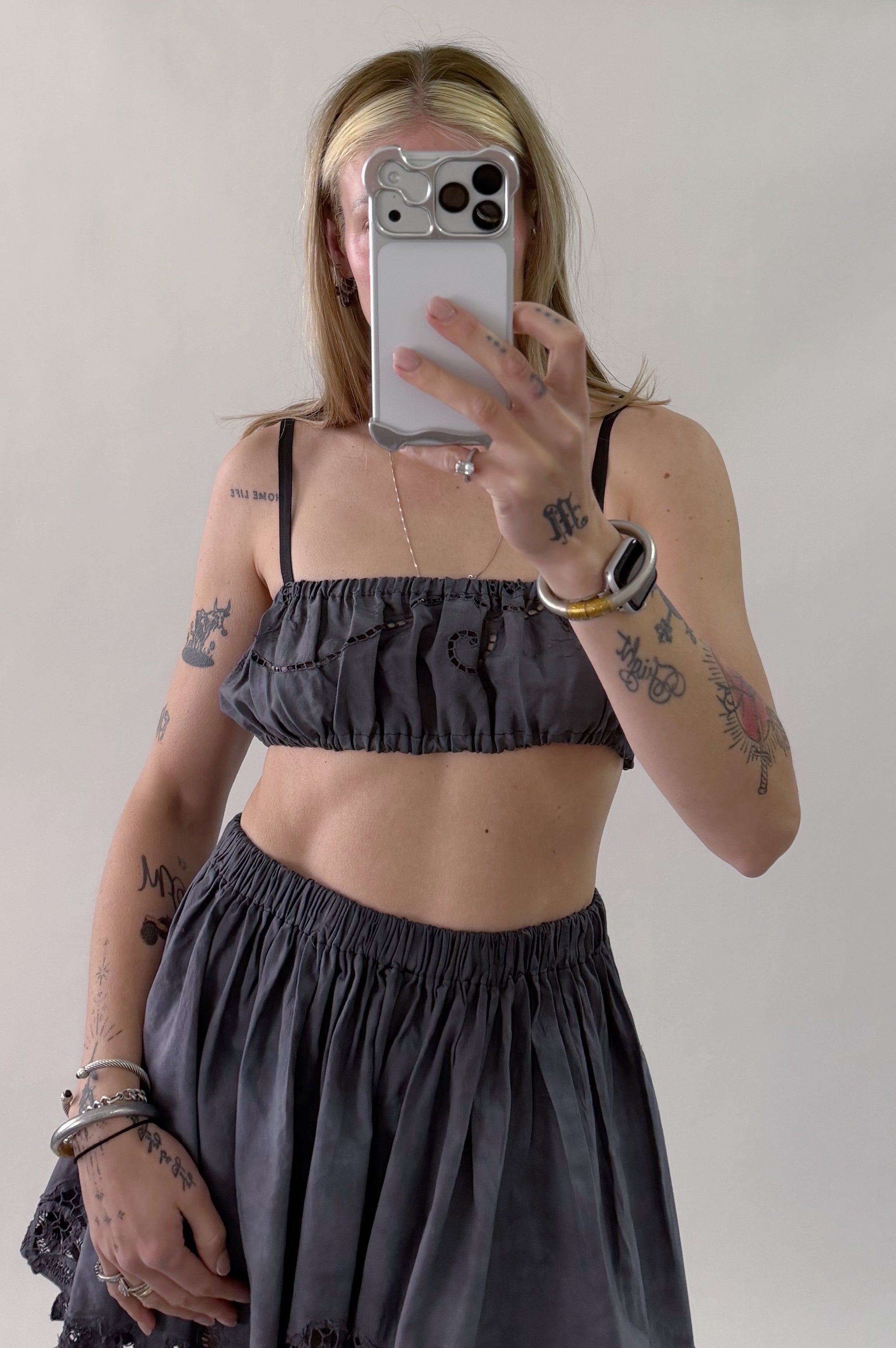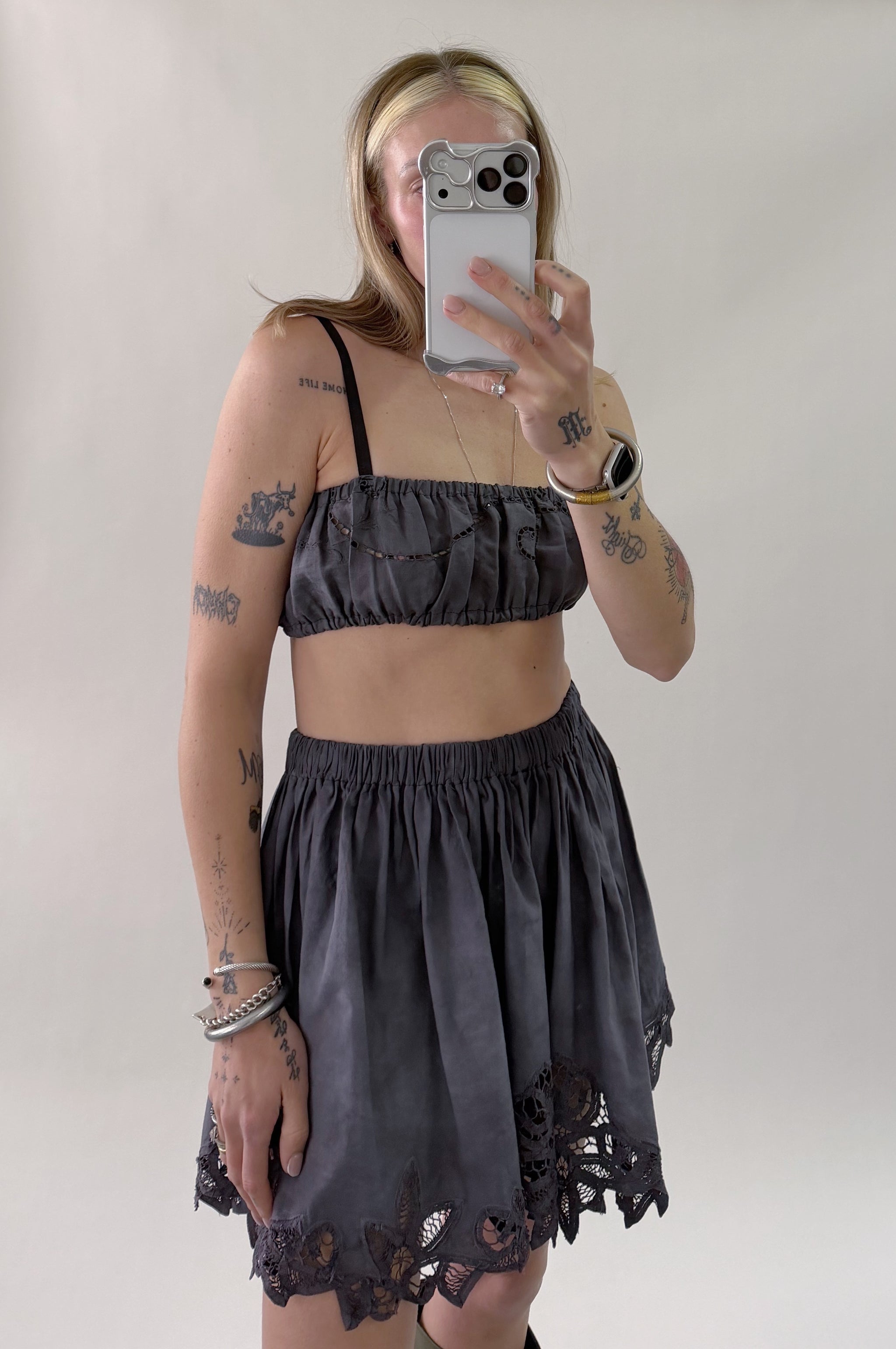 Styles are not pinned, pulled or tucked, they are worn and photographed as-is so that fit is accurately portrayed. Everything is made from vintage, deadstock, or antique materials. Your item may vary slightly from the fabric pictured here or have small flaws. Reducing waste is a top priority, so your item may be patched together slightly, in a non-noticeable way. In another effort to reduce waste, if edges are self finished or will not fray and show, they will be left as-is. The fabric is very delicate, please wear carefully.