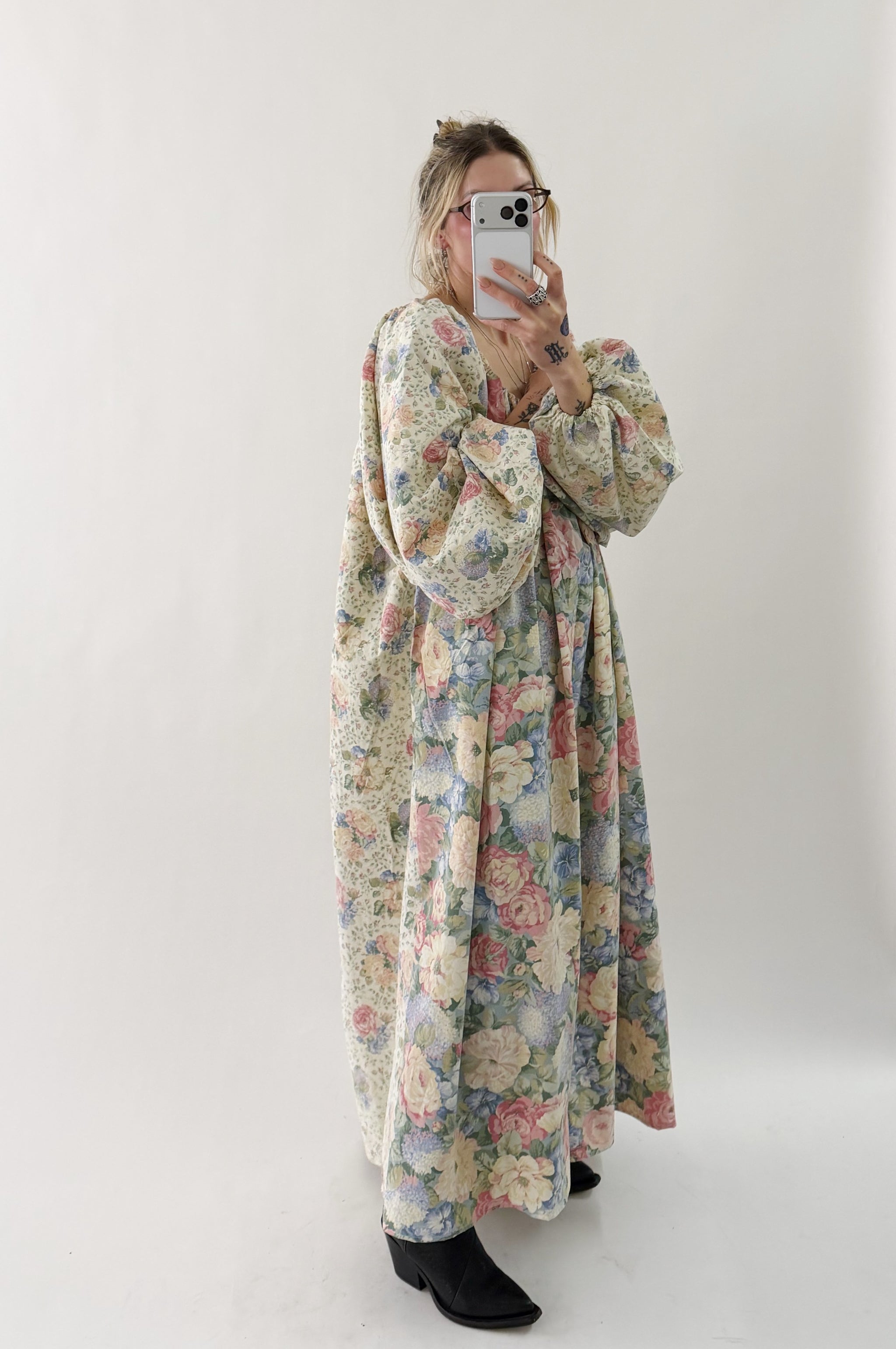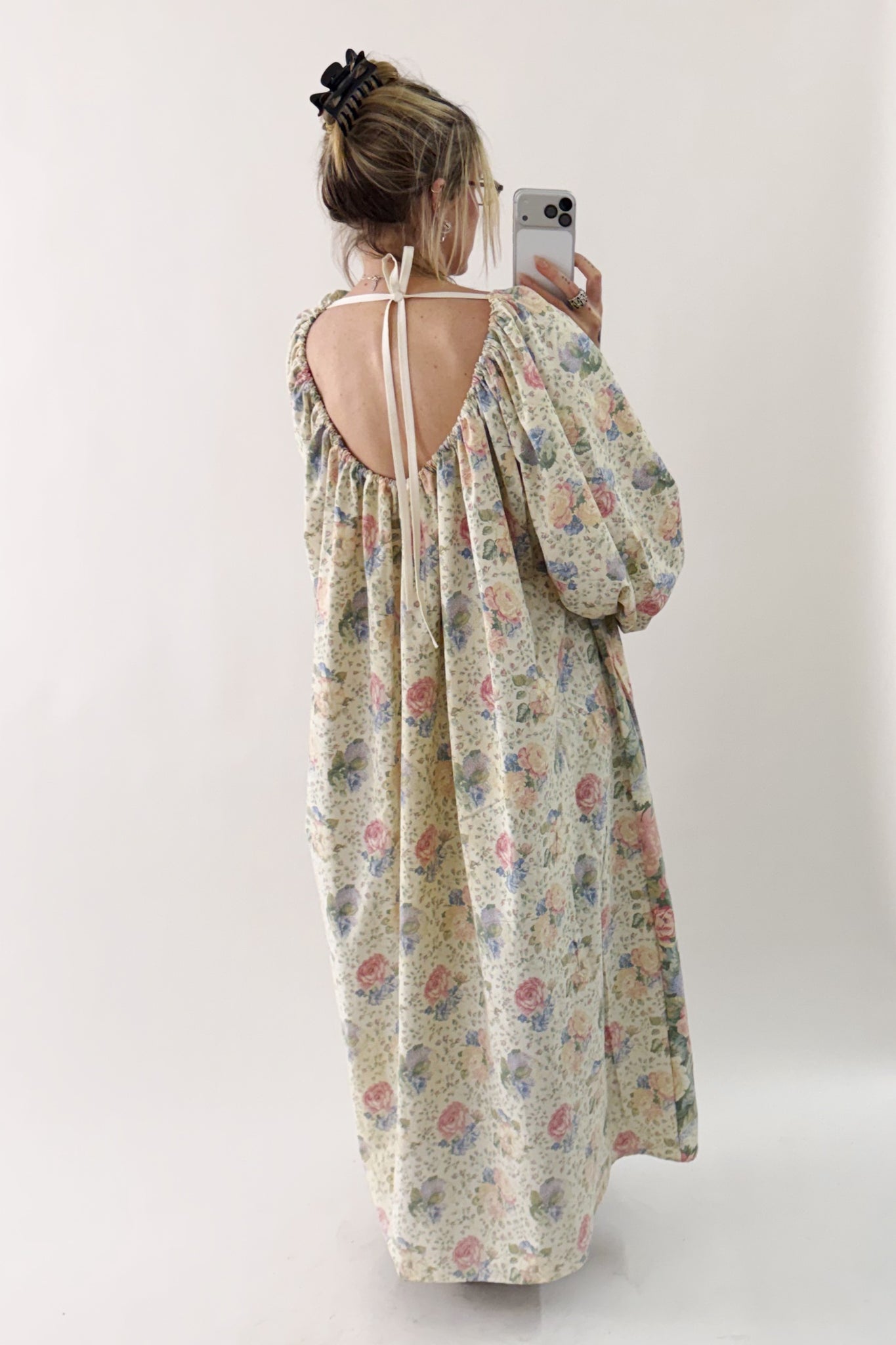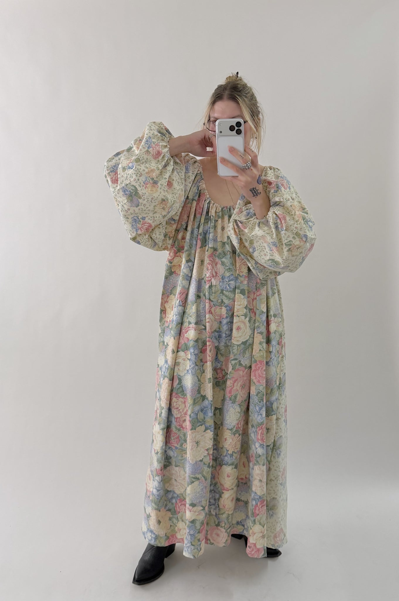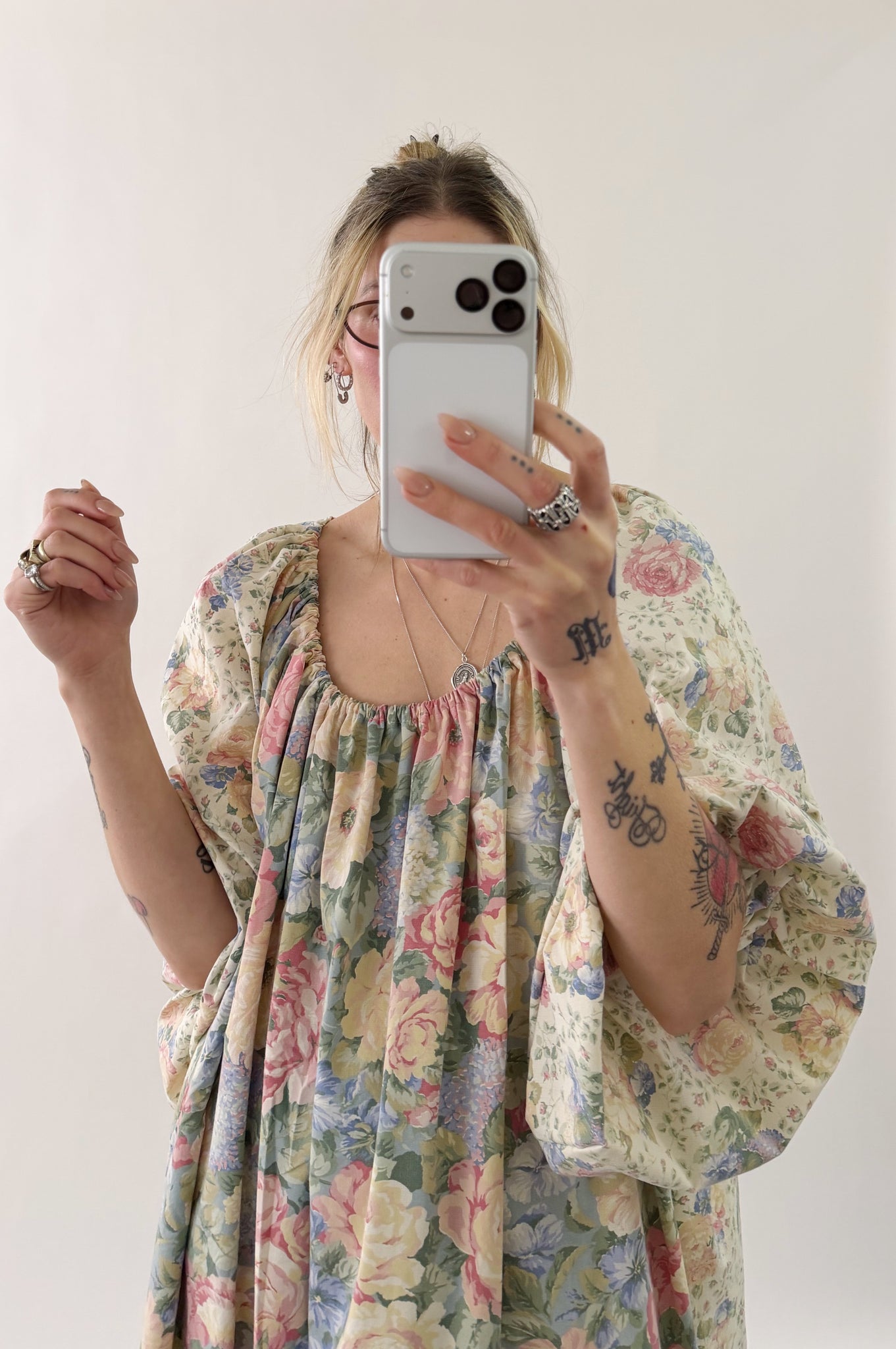 Styles are not pinned, pulled or tucked, they are worn and photographed as-is so that fit is accurately portrayed. Everything is made from vintage, deadstock, or antique materials. Your item may vary slightly from the fabric pictured here or have small flaws. Reducing waste is a top priority, so your item may be patched together slightly, in a non-noticeable way. In another effort to reduce waste, if edges are self finished or will not fray and show, they will be left as-is. The fabric is very delicate, please wear carefully.